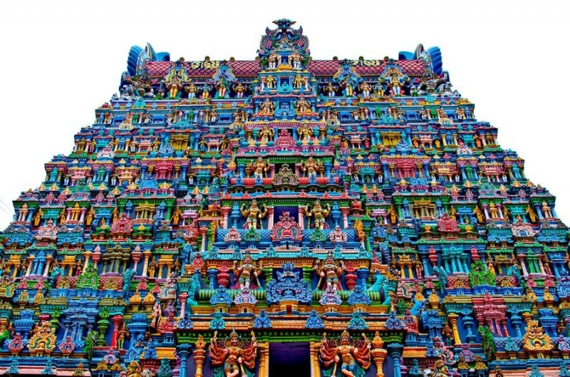 Пирамиди украсени във всички цветове на дъгата са част от комплекса Минакши, намиращ се в древния град Мадурай. Индуиският храм датира от 6 век до нашата ера и е наречен така в чест на богинята Минакши, една от жените на Шива.