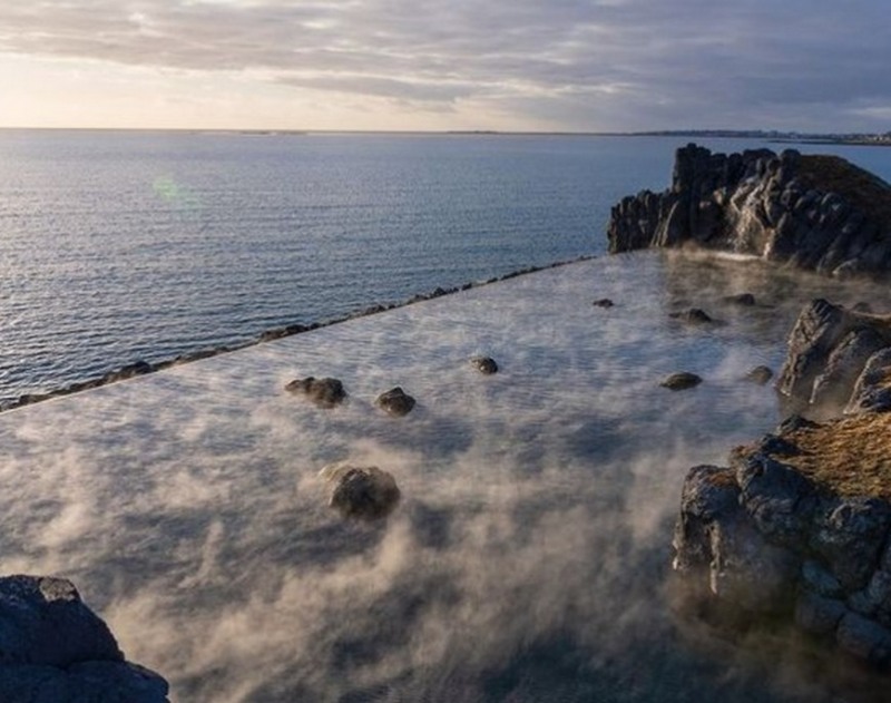Нейният инфинити басейн е дълъг 75 метра и разкрива гледка към Северния Атлантически океан и активния вулкан на полуостров Рейкянес.