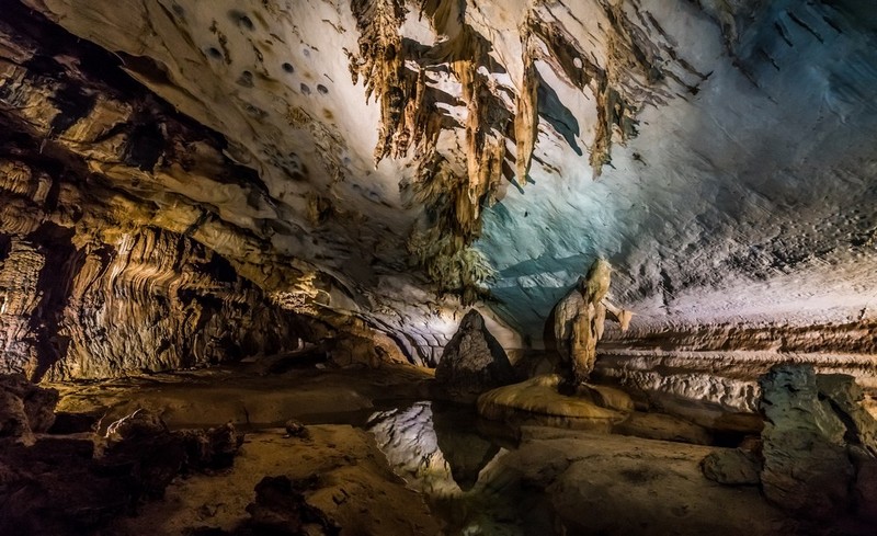 От брега на река до входа на пещерата "Вятърна пещера", наречен така наречен бриз, който се усеща в тесните части на пещерата. Вятърната пещера, която е част от системата Клиъруотър, има много впечатляващи сталактити, сталагмити, потоци, хелитити и скални корали, някои от които са осветени в стаята "Кинг".