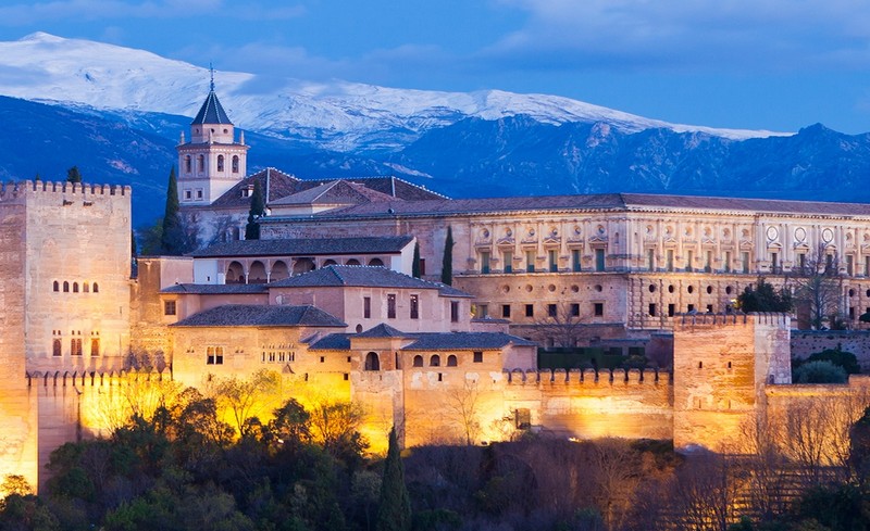 Алхамбра е дворец и крепостен комплекс, разположен в Гранада, Андалусия, Испания. Първоначално е построена като малка крепост през 889 г. сл.Хр. по останките на римското укрепление и след това до голяма степен пренебрегвана, докато руините му бяха обновени и възстановени в средата на 13 век от Насидския емир Мохамед бел Ал-Амар от емирството на Гранада, който построи сегашния си дворец и стени. Той е превърнат в кралски дворец през 1333 година от Юсуф I, султан на Гранада. След завършването на християнската реконкиста през 1492 г., сайтът става Кралски двор на Фердинанд и Изабела (където Кристофър Кълъмбъс получил кралска заверка за неговата експедиция), а дворците бяха частично променени в ренесансов стил. През 1526 г. Шарл I & V поръчва нов ренесансов дворец, по-подходящ за свещения римски император в революционния стил на маневристките, повлиян от хуманистичната философия в пряко съпоставка с нацидната андалусийска архитектура, но в крайна сметка не е завършена поради бунтовете в Гранада.
