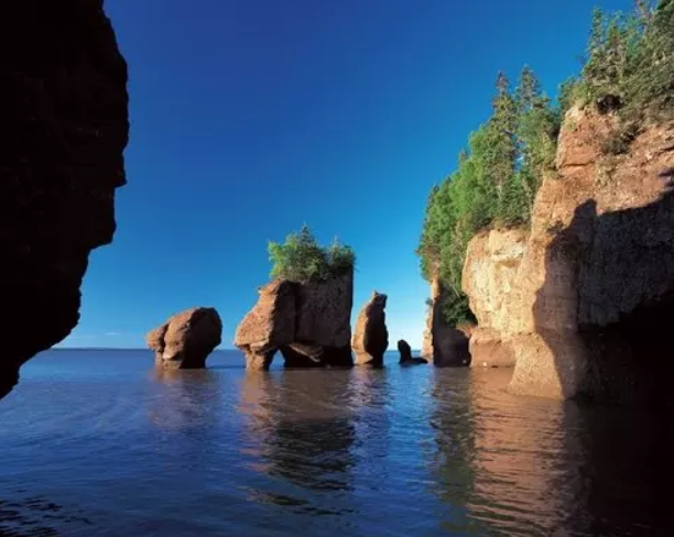 Скалите Хоупуел, разположени в зашеметяващия залив на Фунди в Ню Брънсуик, са уникални скални образувания, изсипани и оформени от приливна ерозия, които оформят долните части на камъните много по-тънки от горните, на които растенията и дърветата растат отгоре. Отидете по време на отлив и се разходете сред лабиринта, който Хоупуел Скали създава, или седнете назад и гледайте как слънцето изчезва и се осветява през скалите по залез слънце.