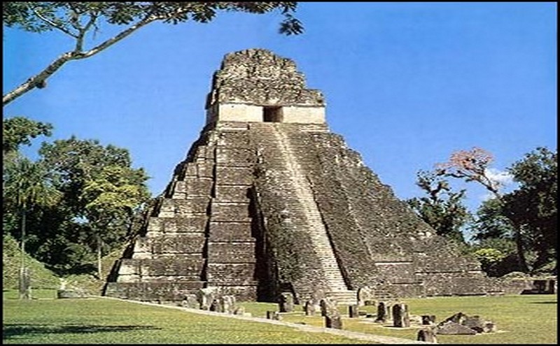 В периода на своя разцвет ( VIII в.) Тикал ( днешна Гватемала ) заемал площ от 120 кв.км и населението му вероятно наброявало 55 000 души. Тикал бил добре устроен град с покрит пазар, игрища за игри с топка, храмови пирамиди и подземни складове за хранителни продукти. През IX в. градът неочаквано бил изоставен.В продължение на хиляда години Тикал останал скрит в джунглата, обрасвайки с буйна растителност. Храмът на Големия Ягуар е построен между 850 и 900 г. Днес той е "освободен" от джунглата и стръмните стълби, водещи към върха му, създават впечатление, че стигат едва ли не до самия небесен свод. Недалеч от този храм, над най-високите дървета на джунглата се извисяват върховете на още няколко древни храмове на маите.
