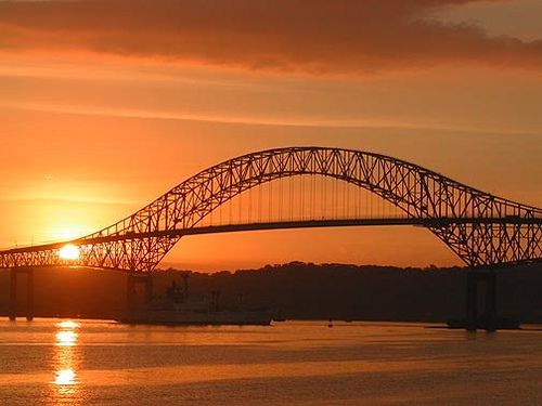 Дългият 5425 фута (широк малко над една миля) мост на Панамския канал в Америка се строи три години и след завършването му се издига на 384 фута над морското равнище, като оставя разстояние от 200 фута (61 метра) за корабите, преминаващи отдолу по време на прилив.
