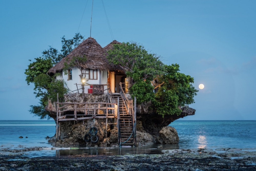 Рок ресторантът несъмнено е най-известното заведение в Занзибар. Нужна е предварителна резервация за групи над 10 човека. Ресторантът е изграден  върху голяма скала в океана. При отлив можете да се разхождате от плажа до ресторанта, а при прилив – отново се качвате на лодката. Гледката е невероятна, а ресторантът сервира много вкусна храна и освежаващи напитки. Разбира се - консумацията се заплаща на място. Тъй като няма ток се готви на газ и ресторантът затваря към 20:00.